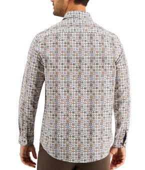 Tasso Elba Men's Stretch Medallion-Print Button Shirt Ivory Brown Combo Size L
