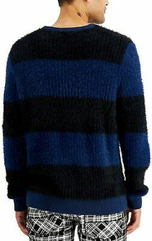 INC Mens Sweater Black Fuzzy Knit Rugby Stripe Pullover Blue Size L MSRP $70