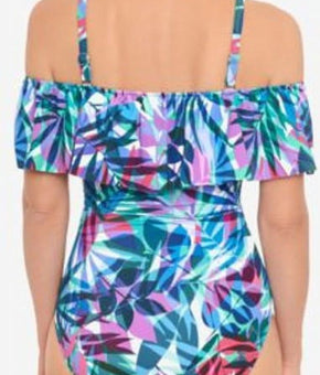 Swim Solutions NEW PRISM MULTI Off-the-Shoulder One-Piece Swimsuit, Size 14 Blue