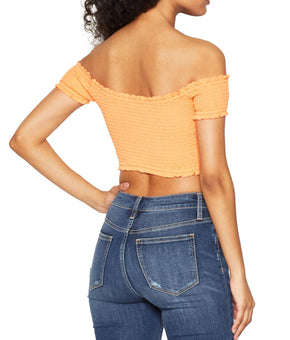 $21.22BCBGeneration Smocked Cropped Top Womens NEON orange Size L MSRP $ 58A smocked silhouette elevates the figure-hugging fit of BCBGeneration's crop top finished with chic cap sleeves.* Ruffled elastic off-the-shoulder...